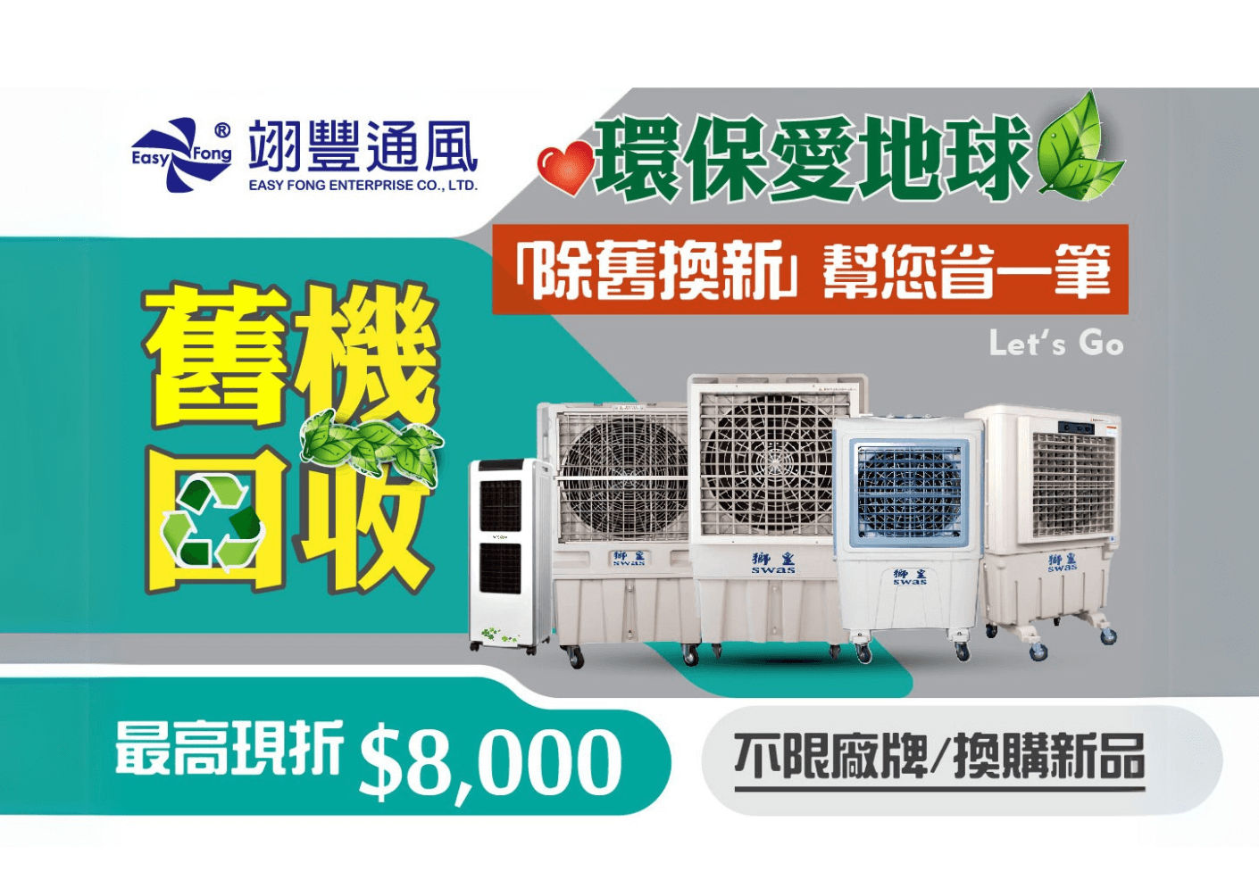 為了讓您輕鬆實現汰舊換新,翊豐通風特別推出了「水冷扇汰舊換新活動」。在活動期間,無論您的舊水冷扇品牌型號如何,只要至翊豐門市,我們將協助您選擇最適合的水冷扇,並提供最高 NT$8,000 元的折扣優惠。翊豐不僅希望能幫您在新年輕鬆升級設備,也希望讓更多家庭、工作場所有個涼快的夏天,更攜手為環保盡一份力。即日起至 2025年3月3 日止 ,不限廠牌型號、無論狀況如何,凡提供任何品牌的舊水冷扇,至翊豐全省實體門市或特約經銷商,即可享最高 NT$8,000 元折扣優惠!