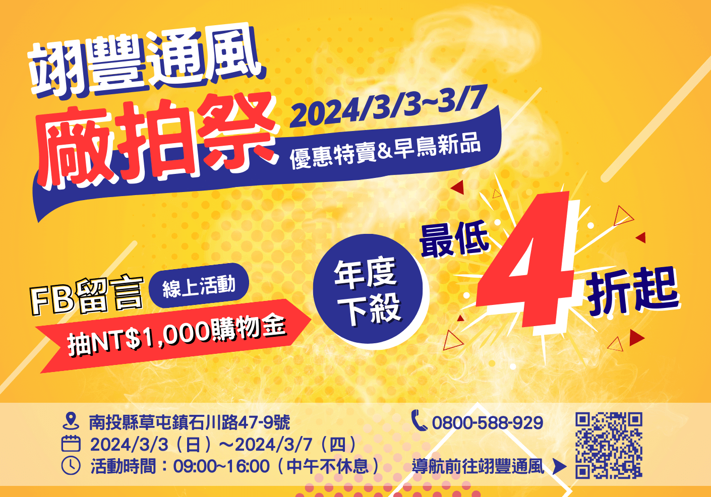 2024 翊豐廠拍祭來了!一年一度的翊豐通風廠拍暨新品展售會將於 3 月 3 日至 7 日,在南投總公司盛大舉辦,今年的廠拍特賣會,不僅有2024最新通風設備產品的展出,還有超優惠福利品及二手機出清,現場還有提供免費水冷扇健檢服務,趁年後開始做工廠、畜舍及溫室通風規劃,趁優惠入手最划算的通風設備,3/3翊豐廠拍祭,絕對是最佳時機!