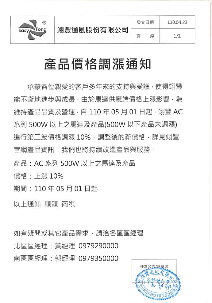 承蒙各位親愛的客戶多年來的支持與愛護,使得翊豐能不斷地進步與成長,由於馬達供應端價格上漲影響,為維持產品品質及營運,自110年05月01日起,翊豐AC系列500W以上之相關產品,進行第二波價格調漲10%,調整後的新價格,詳見翊豐官網產品資訊,我們也將持續改進產品與服務