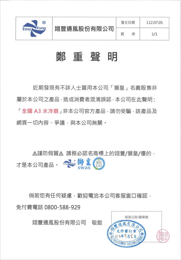 本公司在此聲明:『全國A3水冷扇』非公司官方產品,請勿受騙,該產品及網頁一切內容、爭議,與本公司無關。