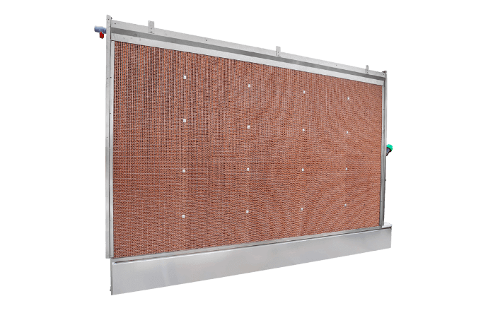 水濂牆降溫系統的降溫過程是由多孔水濂片、水循環系統、負壓風扇組成,當廠房外乾熱空氣被負壓風扇抽吸通過水濂時,水濂片上的水會吸收空氣中熱量,進而蒸發成水蒸氣,透過這樣的冷熱交換處理後,涼爽濕潤的空氣就進入廠房內空氣也會隨之降溫。
